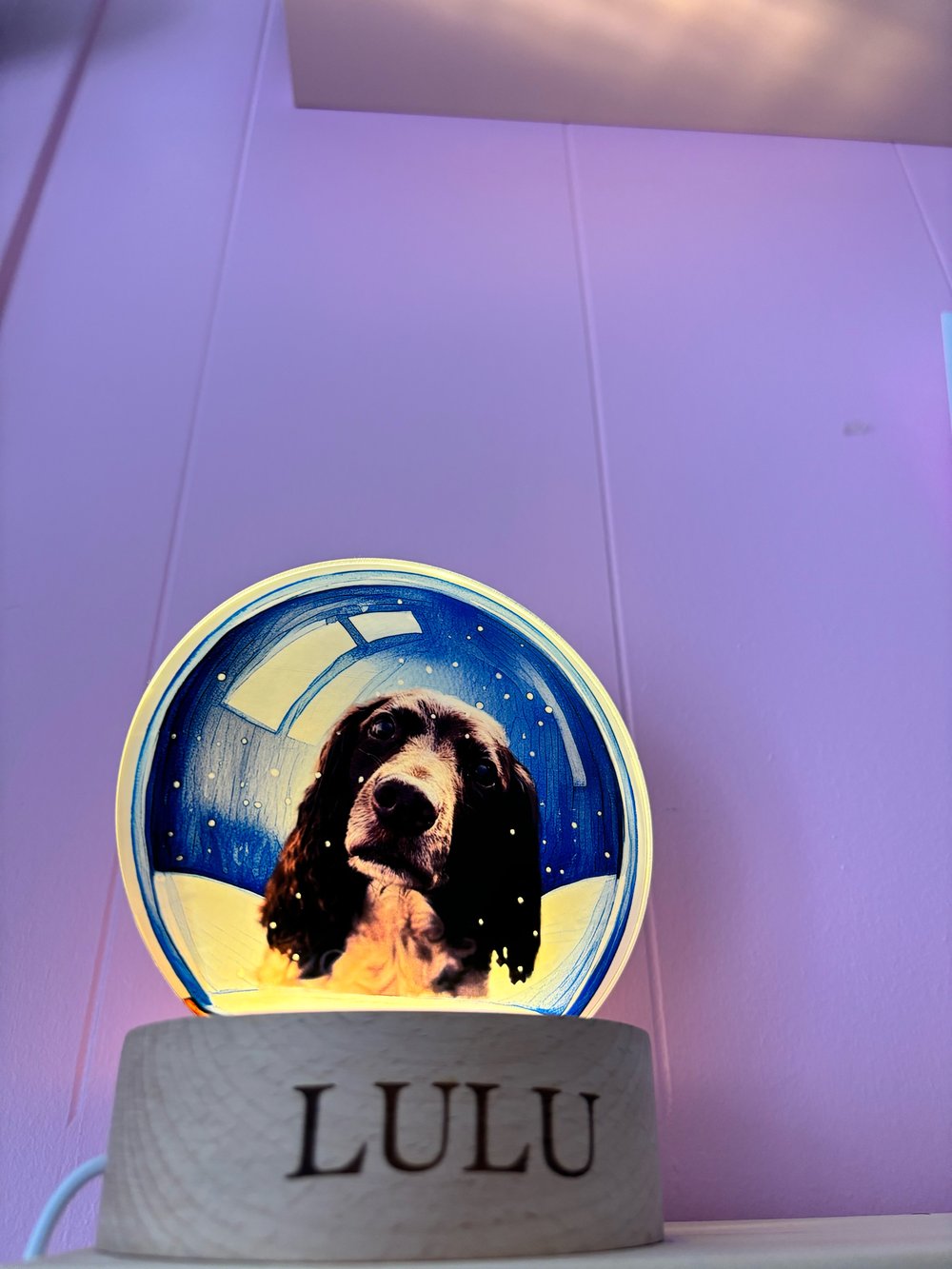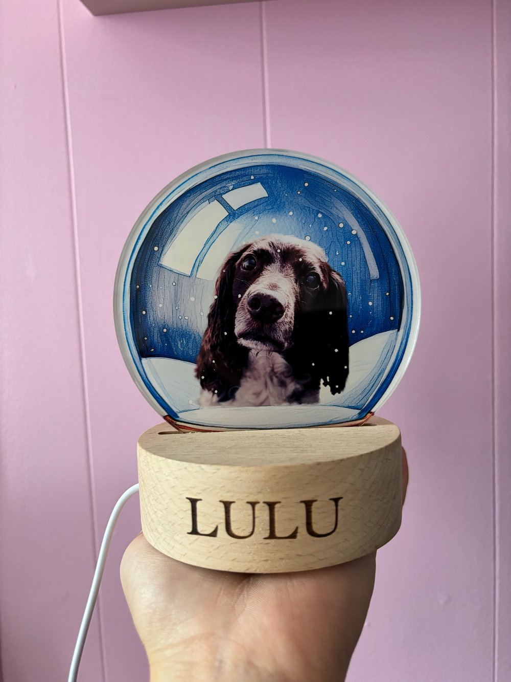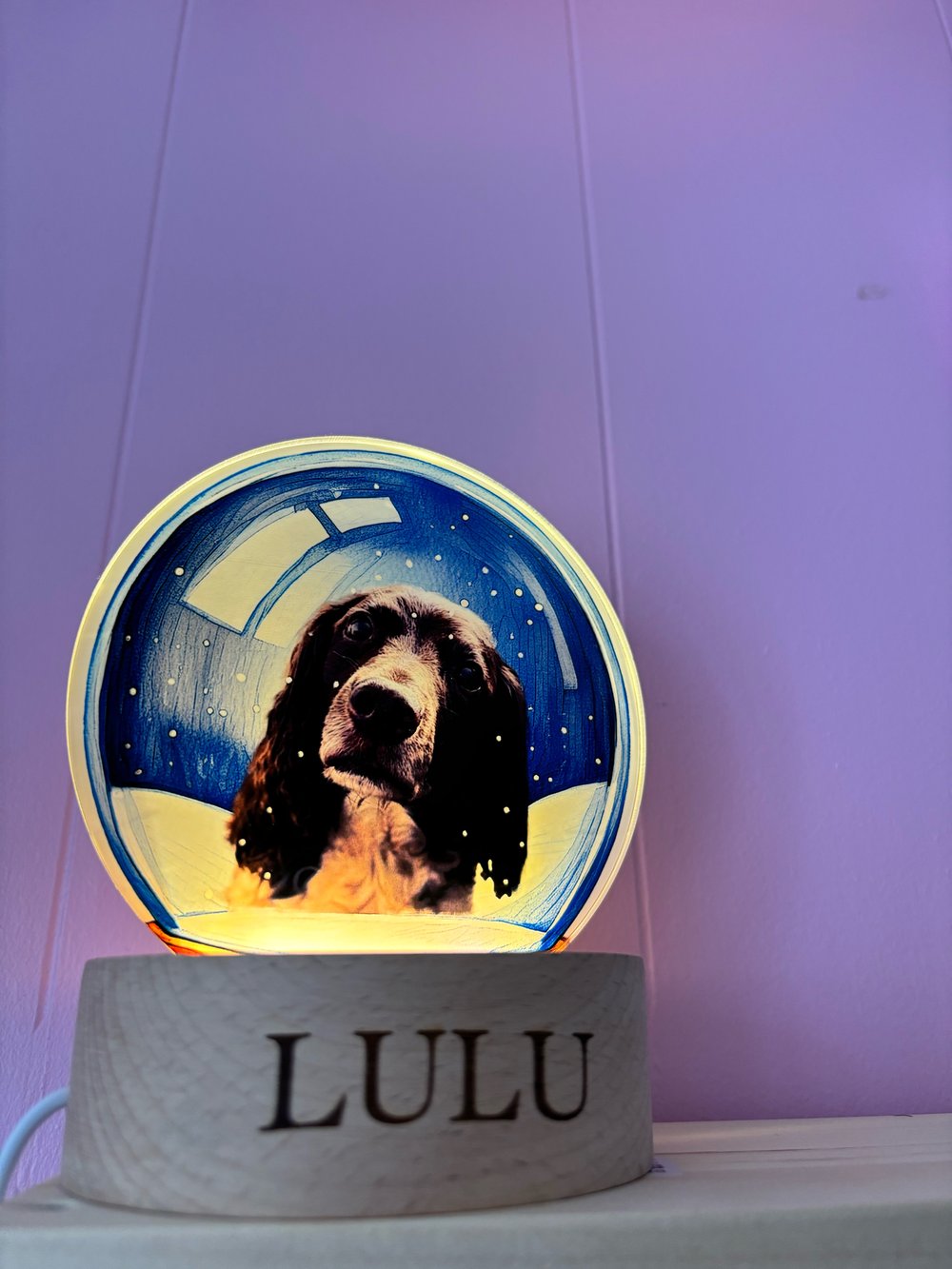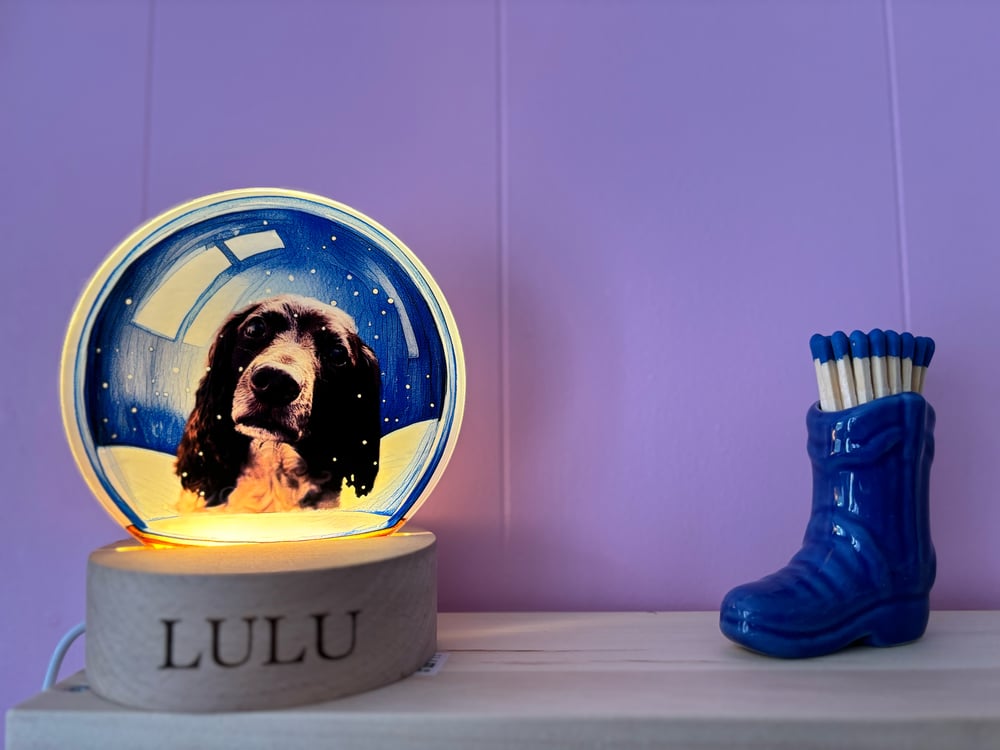 Handcrafted in our studio, we edit your pictures of your beautiful furry family and human family members encased within a beautiful snow globe drawing then printed onto our LED lamps